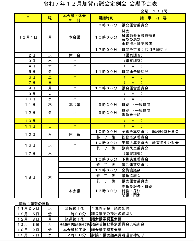 加賀市の12月定例議会の日程が発表されました。12月1日~18日まで開催され、予算や市の施策について討論が行われます。 一般質問は11日・12日の予定です。発言順や時刻が決まり次第またお知らせさせていただきます。ぜひまた ... 続きを読む →