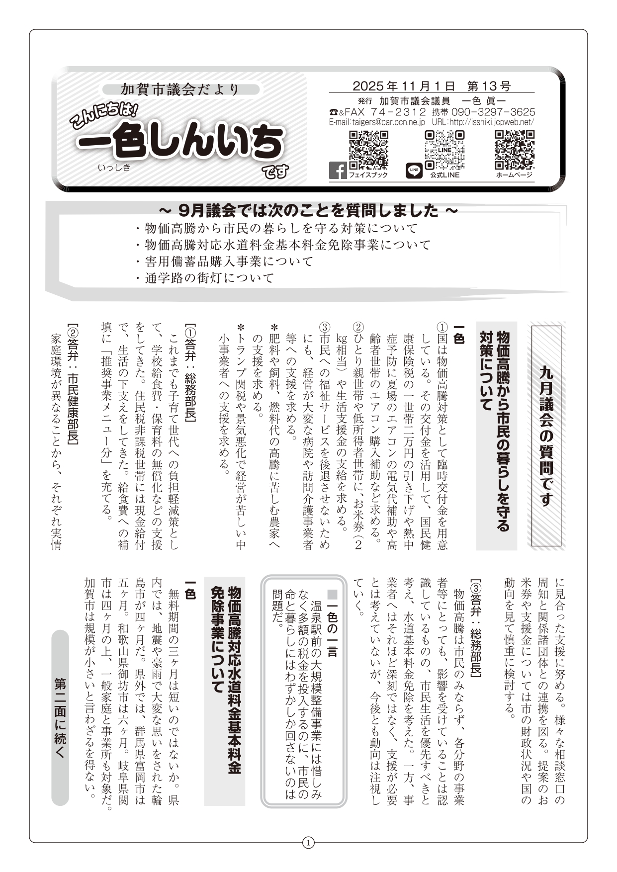加賀市の9月議会も終わり、その内容をまとめて議会報告を発行させていただきました。 今回の議会では、大きく分けて以下の4点を取り上げています。 ①物価高騰対策(ひとり親世帯や低所得者世帯、保育所や学校などへの支援、病院や福 ... 続きを読む →
