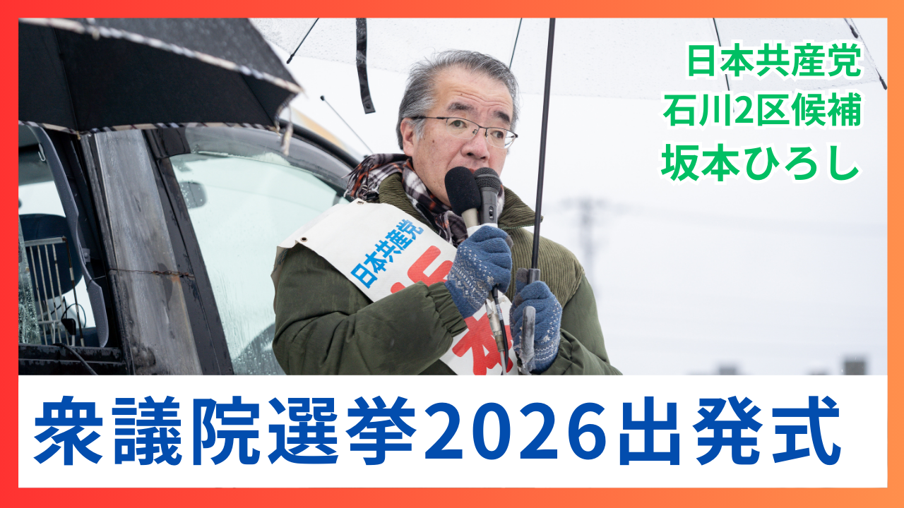 本日、衆議院選挙が公示され加賀市を含む石川2区には日本共産党の坂本ひろし候補が立候補しました。 2月8日の投票日までお世話になりますがよろしくお願いいたします。 日本共産党は「日本共産党」と党名で投票いただく比例代表選挙 ... 続きを読む →