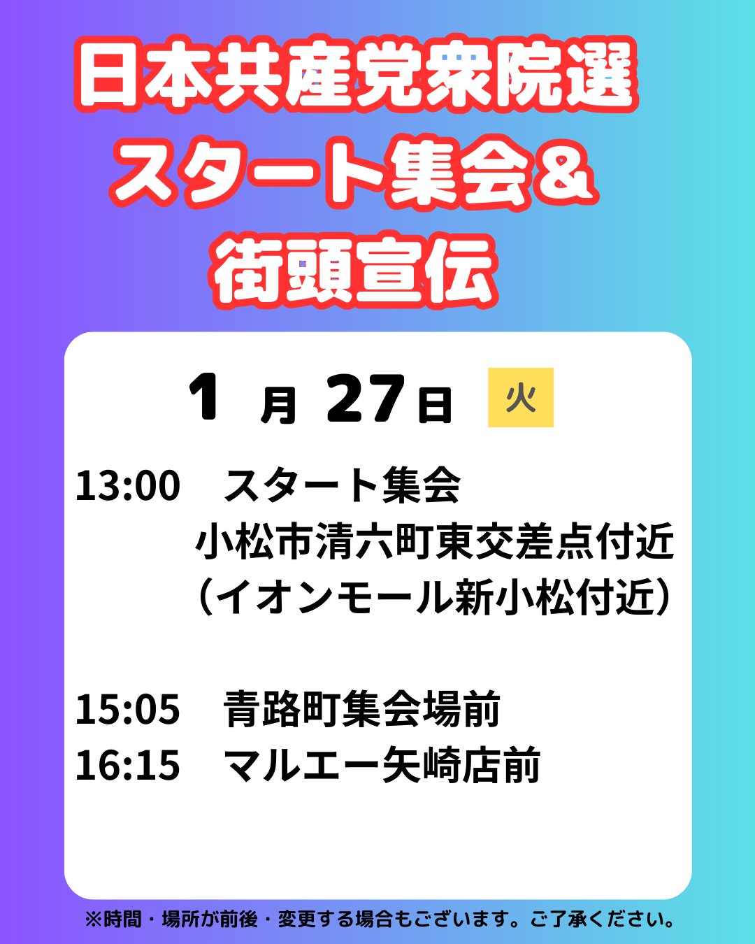 【日本共産党衆院選スタート集会&街頭宣伝のお知らせ】 明日27日から衆議院選挙が予定されています。 日本共産党は石川2区のスタート集会と街頭宣伝を上のように行う予定です。 近くにお越しの際はぜひお聞きください。