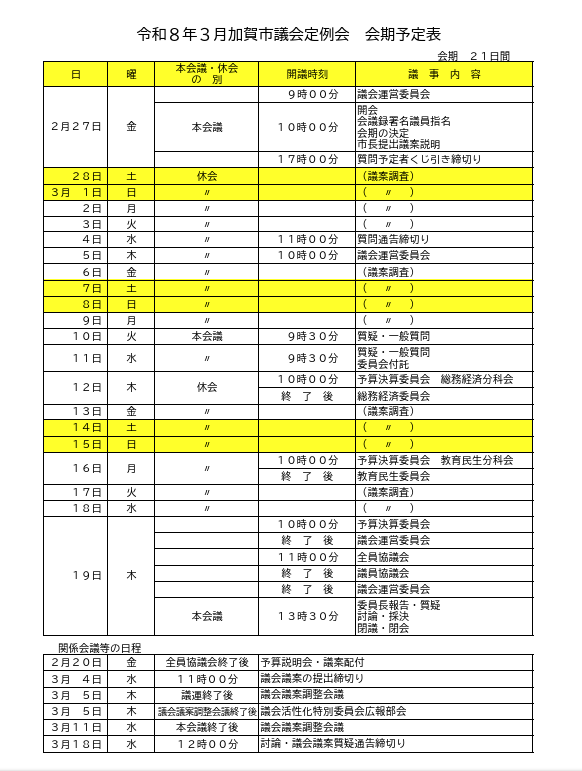 加賀市の3月定例議会の日程が発表されました。2月27日~3月19日まで開催され、予算や市の施策について討論が行われます。 一般質問は10日・11日の予定です。現在調整中ですので、質問の日時や討論の内容についてはおって掲載 ... 続きを読む →