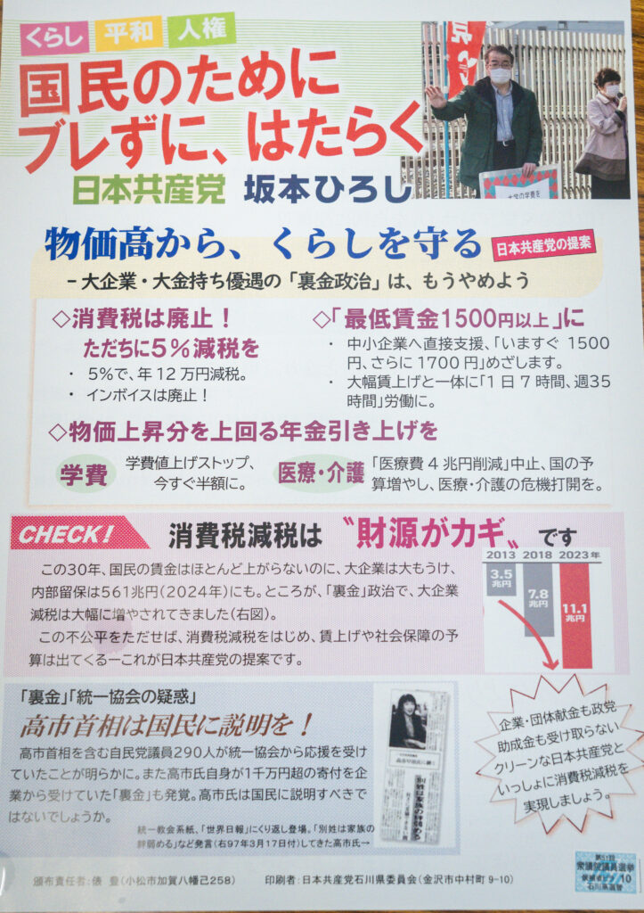 本日、衆議院選挙が公示され加賀市を含む石川2区には日本共産党の坂本ひろし候補が立候補しました。 2月8日の投票日までお世話になりますがよろしくお願いいたします。