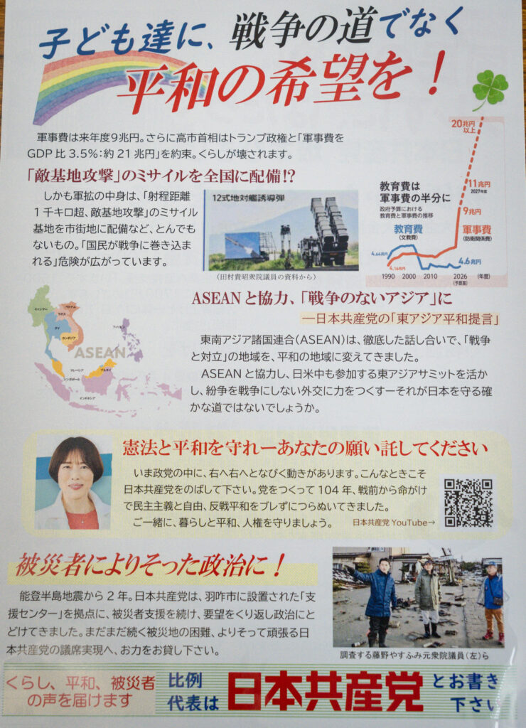 日本共産党は「日本共産党」と党名で投票いただく比例代表選挙で、失っている北陸信越ブロックでの議席を何としても取り戻すこと、各選挙区での躍進を目標に頑張ってまいります。